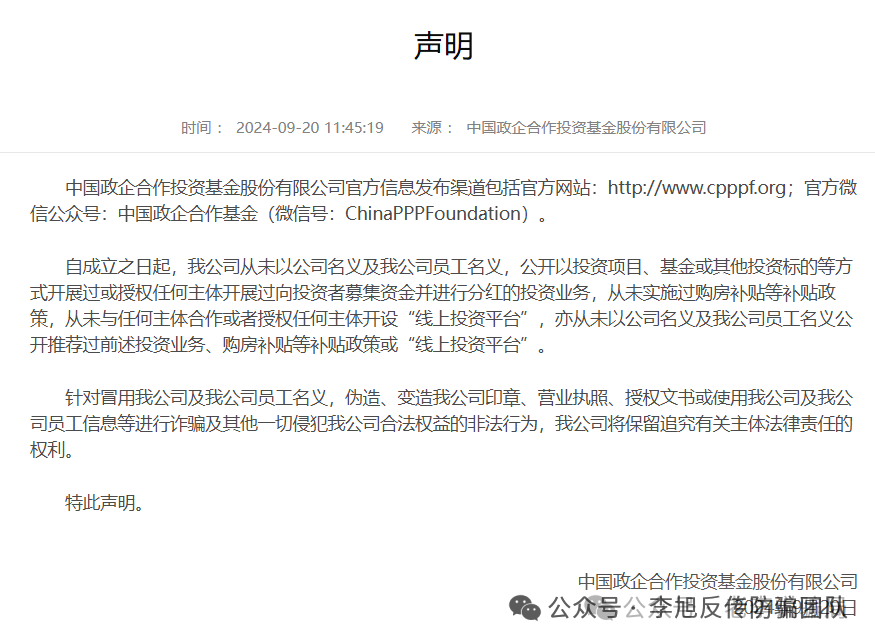 早在2024年,中国政企合作基金官方网站就曾多次发布声明,从未公开以投资项目、基金或其他投资标的等方式开展或授权任何主体开展过向投资者募集资金并进行分红的投资业务,也从未与任何主体合作或授权任何主体开设“线上投资平台”。