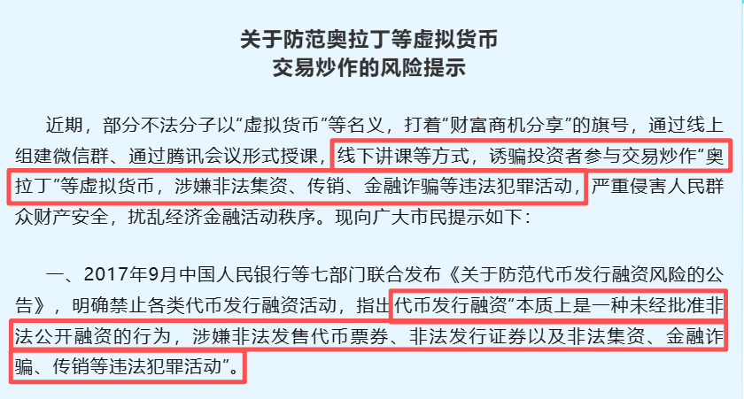 2025年8月,“欧潭融媒”微信公众号发布《关于防范奥拉丁等虚拟货币交易炒作的风险提示》。提示中明确提到:不法分子以“虚拟货币”等名义,通过各种方式,诱骗投资者参与交易炒作“奥拉丁”等虚拟货币,涉嫌非法集资、传销、金融诈骗等违法犯罪活动。(点击↓下图查看全文)