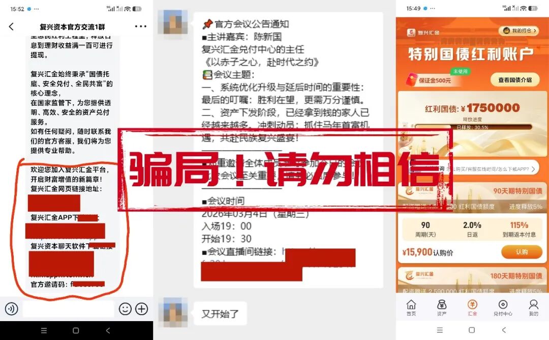 自去年7月突然关网跑路后,如今更名“复兴资本”再次上线,以“150万特别国债”等虚假理财项目又一次打动参与者。