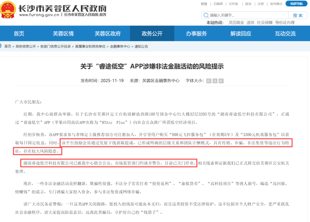 2025年11月19日,长沙市芙蓉区人民政府官方网站发布《关于“睿途低空”APP涉嫌非法金融活动的风险提示》