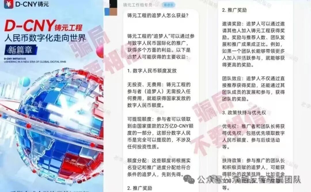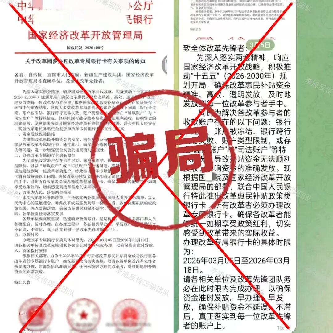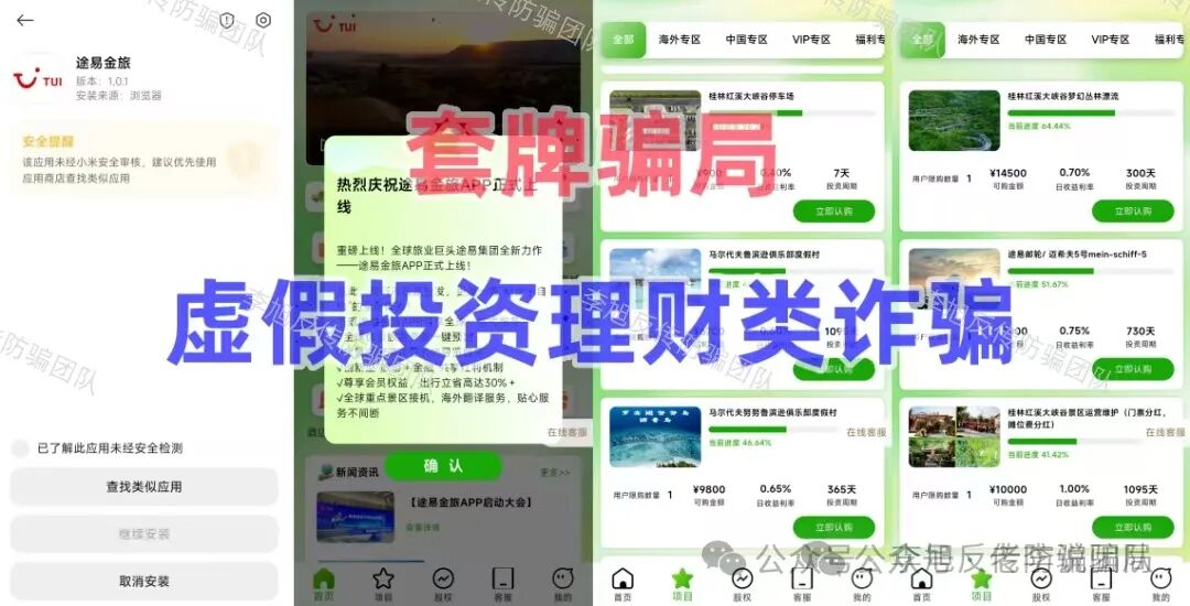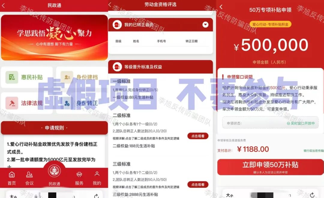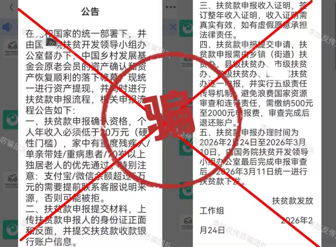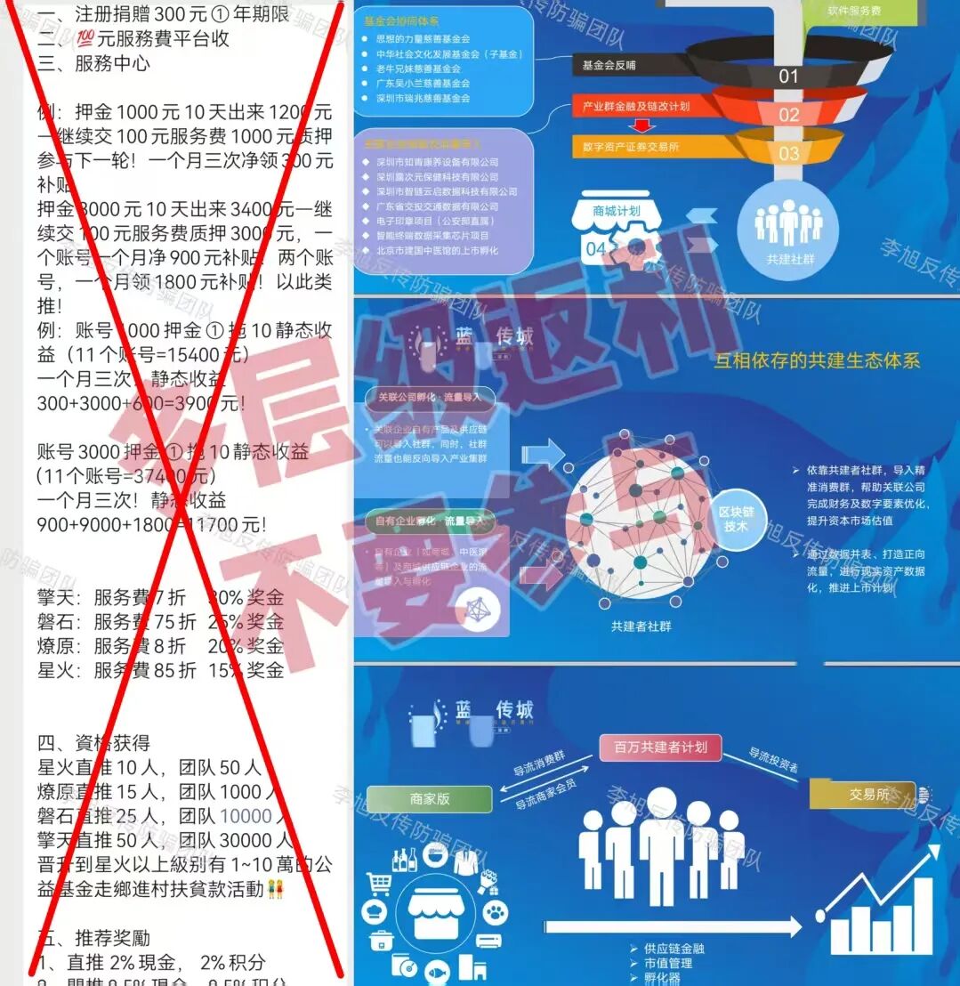 下载软件只认官方应用商店。凡是二维码、浏览器链接、私发安装包的,大多有问题。 弹出风险提示不要忽视。系统不会害你,这是最直接的预警。 警惕“高回报、零风险、稳赚不赔”的项目。正规理财和靠谱项目,从不会用夸张话术承诺收益。 多核实,别跟风。拿不准的软件、看不懂的项目,别着急操作,问问身边懂行的人,多一步核实,少一分风险。 骗子的手段看似花样多,其实核心套路从来没变。这些几毛钱做出来的APP,漏洞就摆在明面上,只要我们不贪小利、不轻信陌生链接、坚守正规渠道,就能牢牢守住自己的钱袋子。 下面这些最近咨询量较大的项目请务必警惕,都是骗子早就设好的圈套! “精准扶贫”APP 利用伪造的工作证冒充公职人员,打着扶贫旗号,谎称参与者提供个人信息并提交全部的银行卡、身份证可领取巨额扶贫款。同时,要求用户将打入银行卡中的资金取出后放置规定地点。 注意!这是非常典型的“洗钱”流程。一旦参与其中,很可能在不知不觉中沦为帮凶。 多地公安都曾对此类利用银行卡洗钱的骗局发布风险提示,千万不要因小失大。切勿向不明人员透露银行卡、身份证信息,更不要按他人要求转移资金。 小剧场 | 警惕这五类洗钱骗局,拒当“工具人”! "我卡里就三毛钱,他能骗走啥?"——99%的人不知道的致命误区 假冒的“乡村发展基金会” 冒充“乡村发展基金会”,利用扶贫款作为诱饵,骗取个人身份信息和申报费。目的也是为了忽悠参与者提供银行卡,使其成为骗子洗钱的工具。 正规的公益基金会绝不会以领取扶贫款、申报补贴等名义收取任何费用,也不会随意索要公民的银行卡、身份证等核心个人信息。 【检法微语】警惕!“中国乡村发展基金会扶贫基金”诈骗新招! “改革圆梦”APP 这个项目运行至今,多次声称可以提现,但没有一次真正到账。最近又开始忽悠参与者办理所谓的“专属银行卡”。这不过只是又一个收钱的名头罢了。 “爱心行动(民政通)”APP 民族资产解冻类诈骗,看似领补贴,实则是借着这个由头收钱。这个项目的破绽实际非常多,不但APP未通过备案,IP地址也在境外,收款方的账号更全是来路不明的个体户。试问哪个“国家项目”如此不正规? 喵某AI 号称是以“AI智能体”为核心,依托所谓的F-S-C生态闭环打造的新型AI电商模式,听着这些名头十分唬人,让人觉得高大上、有前景,实则全是骗人的噱头,根本没有实际的经营内容。该平台还设置了三档入门费,要求参与者必须先缴纳相应的费用,才能获得所谓的推广、分红等资格。说白了,它的盈利核心根本不是真实的商品销售,而是靠拉人头裂变拿返利。 这里要跟大家说一个判断的小技巧,正规的电商平台和AI相关的创业项目,绝不会要求用户先交入门费,才能获得经营、分红的资格,遇到这种先交钱再谈收益的平台,大家直接绕道走就对了,千万不要参与。 蓝某传城 假借“健康中国”,以慈善的名义,把入门费说成所谓的“捐赠”,承诺10天回本和高额收益。同时设置“星火”“燎原”“磐石”“擎天”等多个晋升层级,要求参与者通过直推和团队人数获取服务费折扣和奖金。 这种模式看似是扶贫,实则还是利用新人加入的投资款去填补旧人的收益,属于资金盘逻辑,一旦新人不足,收益将无法兑现,因此才会利用类传销的方式不断发展新人用来维持。但本质上还是一个分钱游戏,风险巨大。 “途易金旅”APP 将旅游与金融结合的分红类资金盘。冒充德国某旅游公司,把旅游产品包装成理财,设定投资周期和不符合市场规律的超高日利率。用户通过U充值进行投资,但收款账户全是随时变更的个人或公司,并不是公账户。同时,这个项目的利率已经超过银行上百倍,完全不是正常旅游行业可以获得的收益。 高回报必定伴随高风险,天上也不会掉馅饼,即便是正规的金融理财也有严格的监管,不会出现超高日利率,更不会要求用户通过虚拟货币充值。请广大投资者务必警惕! “铸元工程”APP 假借推广数字人民币骗取个人信息。 中国人民银行及各个分行都曾发布风险提示,警惕各类“数字人民币”推广骗局! 关于防范“数字人民币投资返现、有偿推广”等新型诈骗的风险提示 “圆梦中央钱包”APP 谎称为实名注册的参与者发放所谓的“909万现金支票”,以此骗取用户详细的个人身份信息。经查询,软件的IP地址显示在境外,明显的诈骗项目。 假冒的“上合慈协”APP 冒充“上合组织”的虚假项目,目前已经更名为“和衷慈协”。 不法分子善于利用大家对官方机构、国际组织的信任,冒充组织打造虚假项目,大家遇到这类声称和国家、国际组织相关的APP,一定要先通过官方渠道核实信息,切勿轻信。 “零碳中国”APP 走的“碳中和”老路,推出“环保币”、“矿机”等等诱导用户投资。APP下载提示未备案且携带病毒。 “以旧换新”APP 有参与者统计,这个项目已经以各种名头向参与者收费多达16次,但依旧有人执意跟随。 小编只想说,若是真的,根本不会一而再再而三的说谎,及时止损才是最正确的选择。 广西临桂33500 有网友反映,去年年底被人骗至广西临桂,对方假借“西部大开发”的国家战略噱头,谎称每投资100元参与当地的飞机场和高速建设,就能获得2元的返利,还说如果不想做了可以随时退出,本金全额返还。单纯的网友听信了对方话术,缴纳2万余元参与其中。但随后,网友