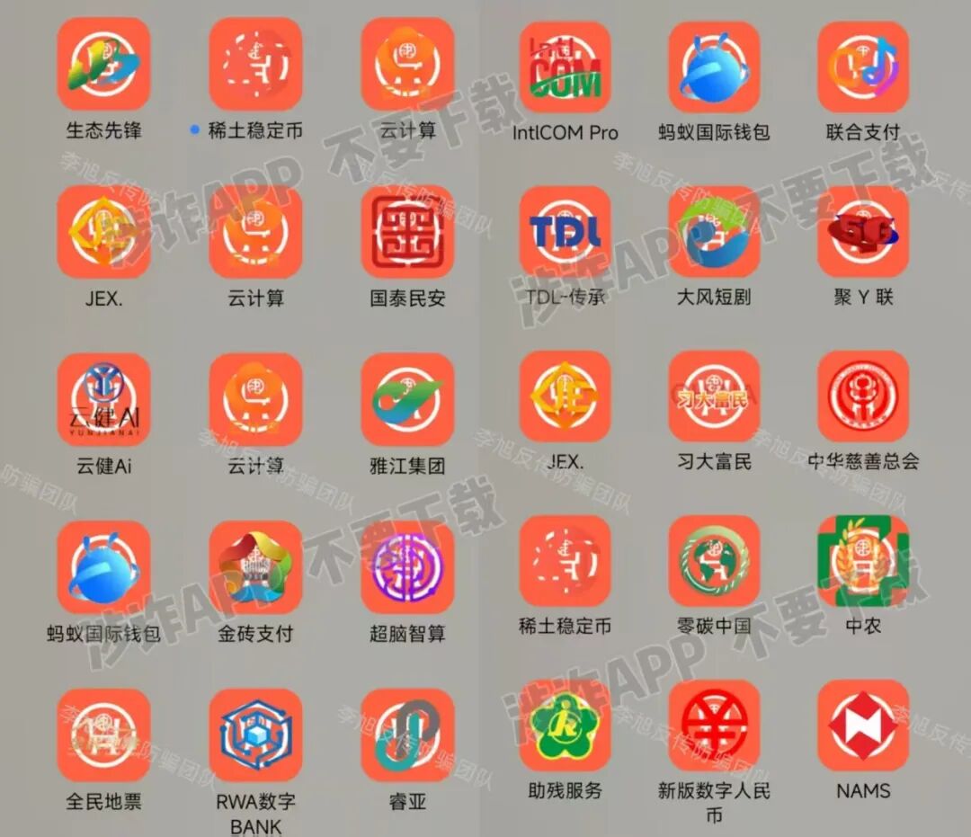 同样需要高度警惕的项目还有:“圆梦钱包”APP“智慧中国”APP“民支付钱包”“华尔街之路”APP“圆梦兑现”APP“红旗河”APP“云数贸系列卡”“终谷集团”“民委扫码走通道”“丝绸之路”“初心驿站”“中国红413”“绿色经济转型”“悦目AI海外版”