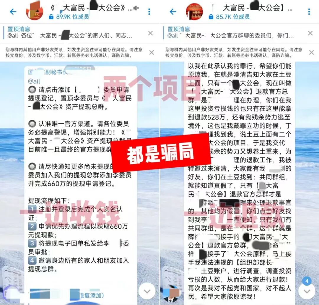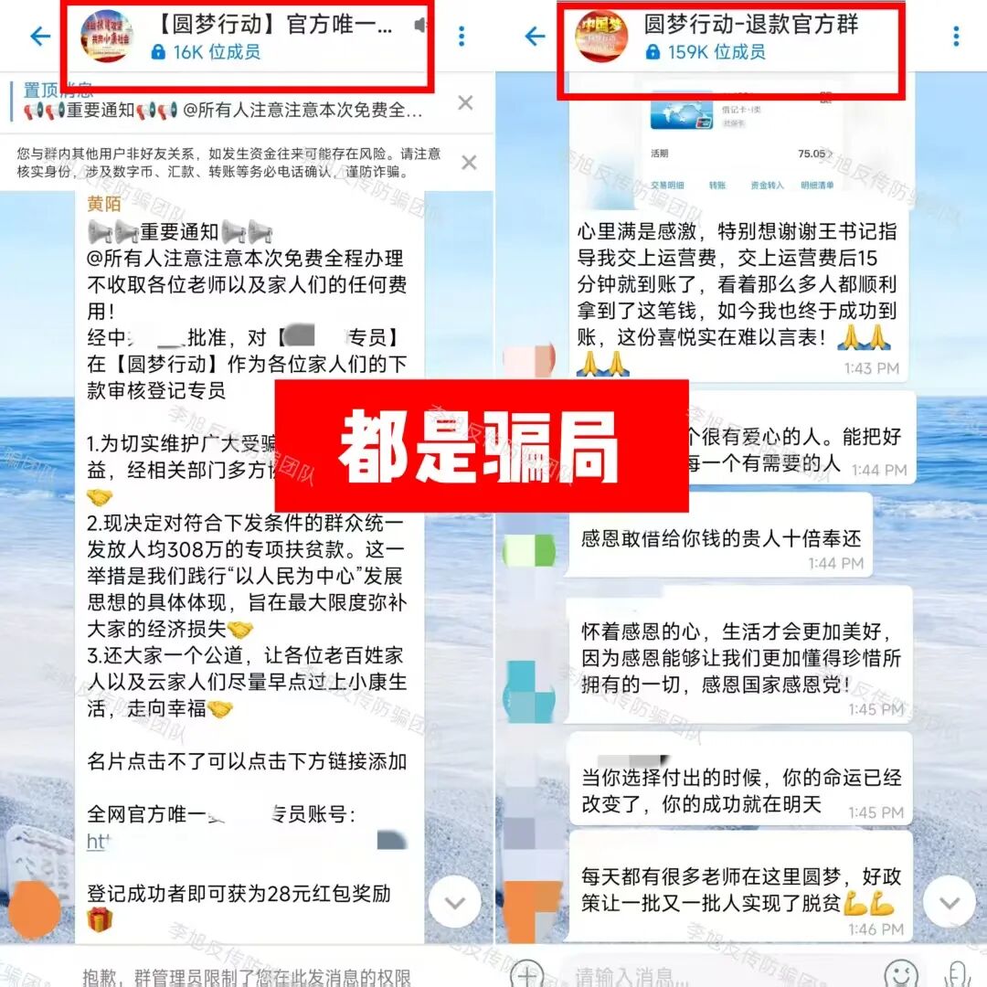 类似的还有“圆梦行动”,也是这般用“发钱群”和“退款群”双向坑人。背后要么是两伙骗子联手作案,要么就是同一伙人分饰两角,分两批收割。