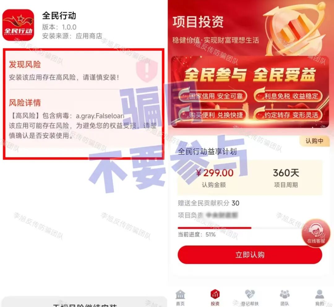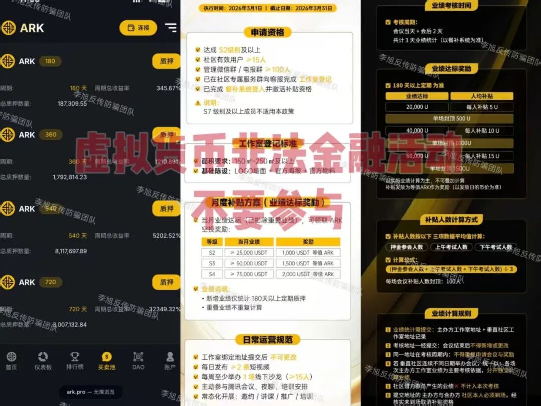 “全民行动”APP 打着“国家项目”的旗号,专门盯着那些因参与网络项目遭受损失朋友,以发放补贴的名义,声称只要实名注册就能领到88600元的补助金。 但事实上,这笔钱根本取不出来!用户还需要通过邀请新人、答题等各种任务获得奖励继续累积,满10万才可提现。而所谓的“登记帮扶”资金,也需要拉新人来“确认”才能申请。 由此可见,所谓的“补贴”不过就是一个噱头,目的就是为了套取用户信息,再忽悠大家认购理财产品,通过各种规则,诱导用户拉人加入,持续不断获得新的资源。 该APP在应用商店查询不到,只能通过链接复制至浏览器下载,安装时就已经提示存在高风险且携带病毒。 那些看得见摸不着的“巨额回报”,往往只是软件里的一串数字,等想提现时,什么手续费、保证金都将接踵而至,直至对方关网,彻底消失。 套牌“河南矿山”项目 今年年初,一个套牌的“河南矿山”APP冒用“河南矿山起重机有限公司”信息制作涉诈软件,打着其名义忽悠参与者认购虚假理财产品。 2月3日,正牌公司发布声明,明确表示这个APP与之没有任何关系。随后,该APP突然无法打开,关网跑路。 河南矿山|关于不法人员冒充我公司名义进行诈骗活动的郑重声明 但最近,又一个同样打着“河南矿山”旗号的项目再度出现,宣称要为参与者发放安置房和福利,并在境外聊天软件“土豆网”中大肆宣传,忽悠用户填写登记表套取用户信息。 请注意!这又是一个“李鬼”项目,跟真正的“河南矿山”公司没有半毛钱关系!目前,这个项目还在宣传期,暂时没有对应APP。还请广大网友务必警惕,不要相信,以免再次上当! 喵某AI 号称是以“AI智能体”为核心,依托所谓的F-S-C生态闭环打造的AI电商模式,实际都是唬人的噱头。 平台设置了三档入门费,要求参与者必须先缴纳相应费用,才能获得所谓的推广、分红等资格。 说白了,它的盈利核心根本不是真实的商品销售,而是靠拉人头裂变拿返利,这就是典型的传销式骗局。 正规的电商平台和AI相关的创业项目,绝不会要求用户先交入门费,才能获得经营、分红的资格,遇到这种先交钱再谈收益的平台,大家直接绕道走就对了,千万不要参与。 铃某AI写小说 宣称能用AI技术自动接单写小说赚钱,听着确实很新潮。 根据平台规则,用户只要花1480元买一个AI分身,每天就能稳赚8-15元,新出的3.0版本更是把年化收益吹嘘到了10000%。如此简单的操作方式和惊人的收益着实吸引了一大批中老年朋友。 但是,单单这份收益就十分离谱。写小说的利润本身很有限,一个AI工具又怎么可能带来这么高的稳定收益?钱从哪来? 有参与者曾表示,平台称用户是利用分享赚钱。可实际加入后,必须发展10名下线,组建团队后才能拿5层下线的10%收益,这明摆着就是“入门费、拉人头、团队计酬”的传销架构。 您到底是在为“AI创业”买单,还是在为拉人头的“金字塔”垫底,一想便知。 “全民化债”APP 针对负债群体,谎称由财政部等四部门发放了50万亿的“化债专项资金”,利用中老年人急于化解债务的心理,引诱他们实名注册。同时,用“股权”、“现金”奖励作为诱饵,鼓励用户不断拉新人加入。 但这些奖励都是“空中楼阁”,根本无法兑现。反而成为了对方敛财的工具。 大家越是心急,越容易病急乱投医,结果很可能旧债未清,又添新伤,造成二次伤害。 “民政通讯”APP 利用所谓的“养老保障援助金”吸引了一大波中老年参与者。随后通过各种推荐奖励诱导用户持续拉新。 但是,这个软件并未通过备案,参与者还必须手持身份证拍视频上传才视为加入。 看似不花钱只提交个身份信息就能领钱,殊不知这个举动本身就会给大家带来诸多危害。 不仅可能导致身份被冒用,甚至有可能会让您在不自知的情况下成为违法活动的“替罪羊”。 提醒丨拍过手持身份证照片的看过来,小心别被坑了 切勿为了这点小利,而造成无法挽回的损失。 SOlulu 它自称是“稳定币基础设施平台”,根据投入资金多少来划分等级和收益,同时,拉新人还能获得最高50%的收益加速。甚至承诺可以用很低的折扣购买所谓的“空投”。这些眼花缭乱的高收益承诺,都是为了吸引参与者不断投钱和拉人。 在我国,未经批准的代币发行融资活动涉嫌非法金融活动。 八部门:虚拟货币相关业务,境内一律禁止! 这种模式的收益没有真实的业务利润支撑,纯粹是靠后来者的资金支付前面人的收益,是典型的“庞氏骗局”,一旦没有新人加入,崩盘是瞬间的事。 ARK-DeFAI 方舟之境 打着“元宇宙质押理财”旗号的项目。目前,其代币价格已经暴跌了99%,实际上游走在崩盘边缘。 但即便如此,它仍然在用极具诱惑力的补贴政策,引诱参与者开设“工作室”去拉拢新人。 此举很可能是在寻找最后的“接盘侠”,风险极高,请务必远离。 华某健康拼团 夸大保健品功效,并设计了复杂的“拼团双循环”模式。用户需要先花499元购买产品,然后再推荐3人加入或自己再花2000元购买,才能获得拼团资格。之后通过所谓的“7人成团”公排机制进行返利。 这种模式层级分明,完全符合“入门费、拉人头、团队计酬”的特征。 最终,底层参与者为了晋级,要么自己大量囤根本卖不掉的货,要么就把亲友拉进来,结果成了金字塔底层的牺牲品。 套牌的“中信资本”APP 套用“中信集团”名义的虚假理财项目。最高日收益率超过3%,这在正规金融市