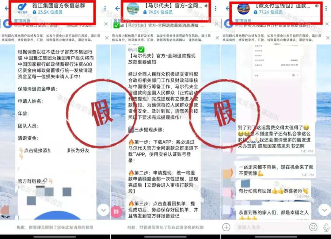 据小编不完全统计,目前网络上打着“退款”名义出现的骗局还有很多,比如:“微支付宝钱包退款”“马尔代夫全网退款”“雅江集团清退”“四行退款”“华为世界退款”等等,都是骗子为网络项目参与者设置的二次诈骗。